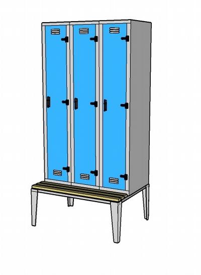Diecast hinges support the doors which are punched with louvres for ventilation. Each compartment is fitted with a shelf level.This locker is of a riveted construction, no welding to compromise the zinc coated material, powder coating is done for additional protection and aestehetics. Fitted with Meranti timber slats protected with 2 x coats of clear lacquer.