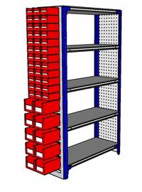 Fitted with 72 x SB105 storage bins and single side perforated panel with uprights supplied with zinc galvanised feet . Each shelf has a bottom support brace.