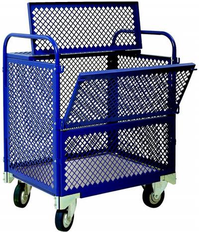 S130 trolley with two handles, one hinged side on top for easy access and four machined perforated sides. Robust trolley manufactured from 3mm quality steel and 20mm tubing, with 1,6mm galvanised sheet steel base. Epoxy powder coated in RAL 5002 navy blue.